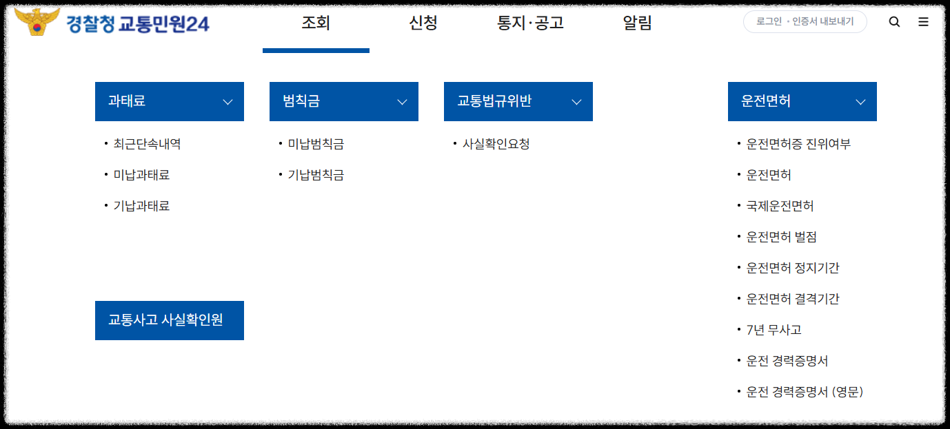 신호위반이 적발되면 보통 1~2일 후에 정보가 업데이트되므로, 실시간으로 조회하는 방법이 궁금할 수 있습니다. 신호위반 실시간 조회는 경찰청 교통민원 24 홈페이지를 통해 간편하게 확인할 수 있습니다. 조회 방법은 간단합니다. 먼저 경찰청 교통민원 24 홈페이지에 접속하여 로그인한 후, 상단 메뉴에서 조회를 클릭합니다. 그 뒤에 미납 과태료 또는 미납 범칙금을 선택하고 주민번호와 차량번호를 입력하여 조회하면 됩니다.